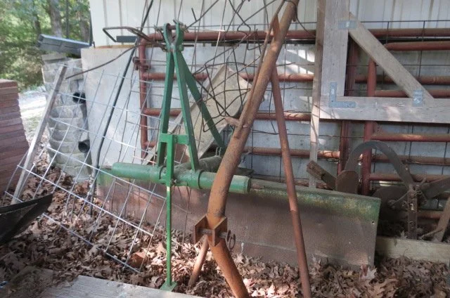 3 point 6’ brush hog, 3 pt auger-9”-12” bits, 3 point pallet forks, Ferguson 6’ drag DISK, 3 PT 6’ John Deere blade, 3 pt tractor boom, 12’ and 14’ gates, scaffolding, tractor tool bar, shed door frames w/tracks, tractor umbrella, lot lumber,