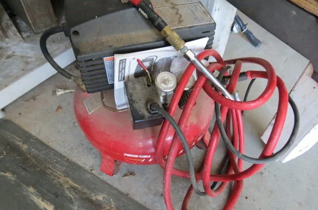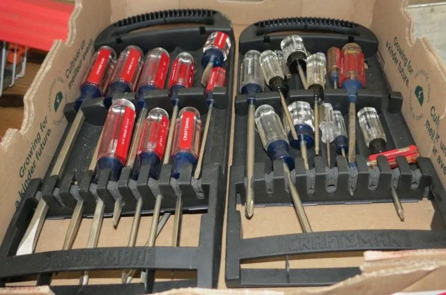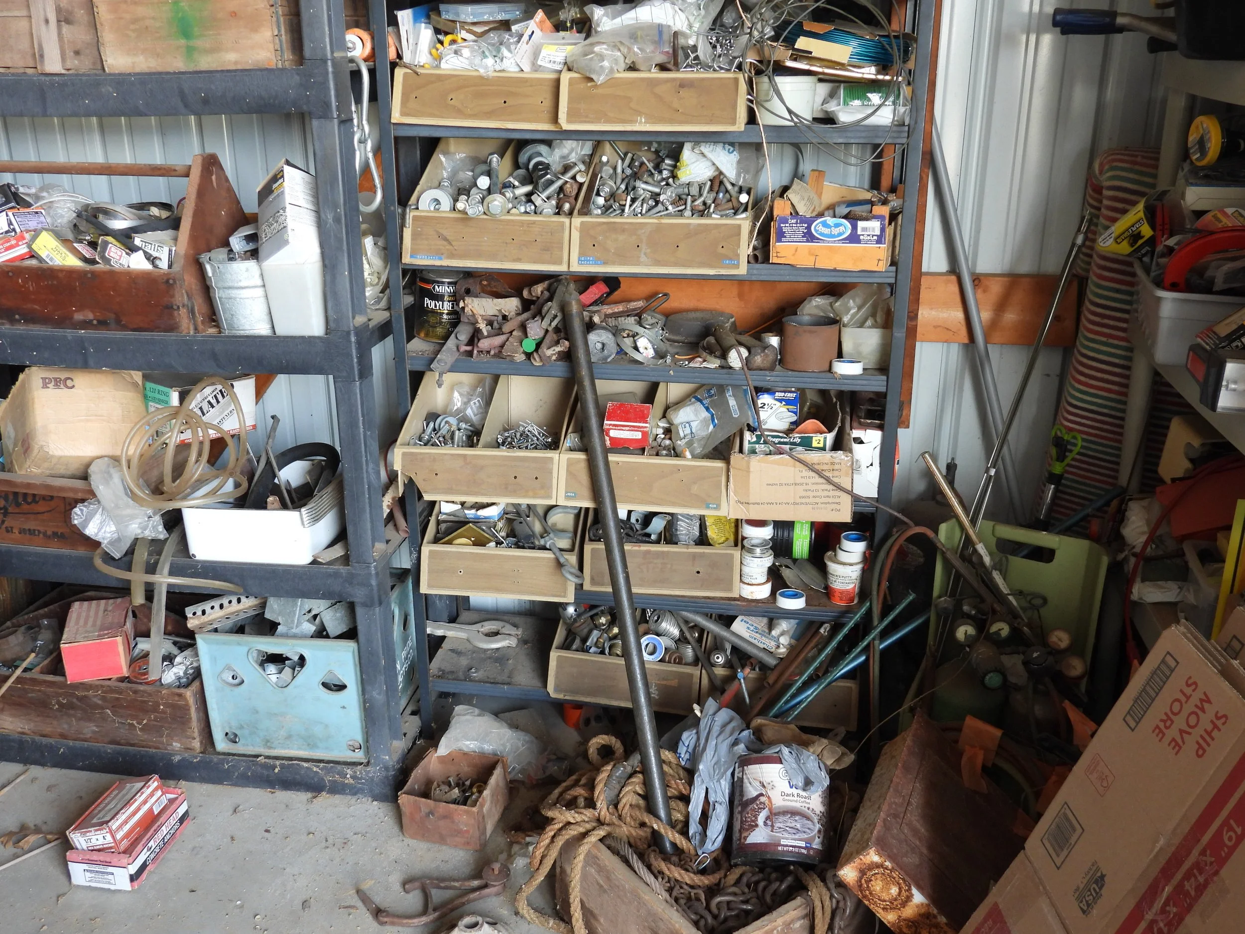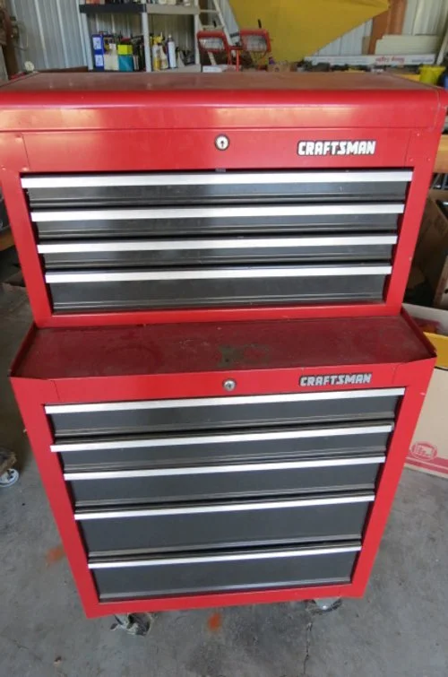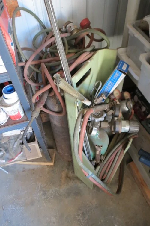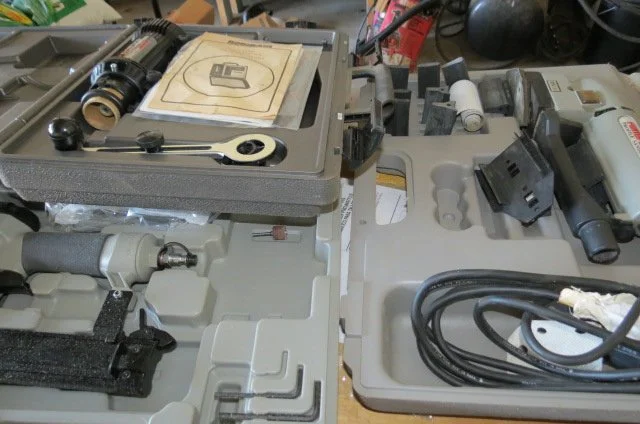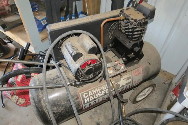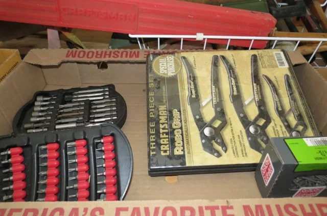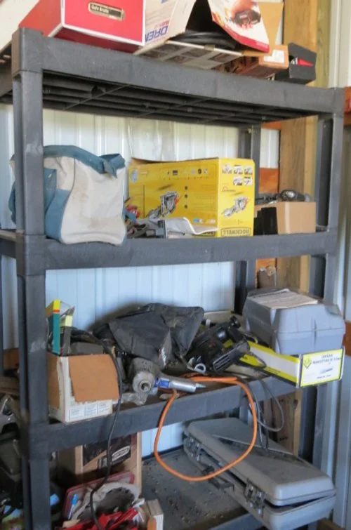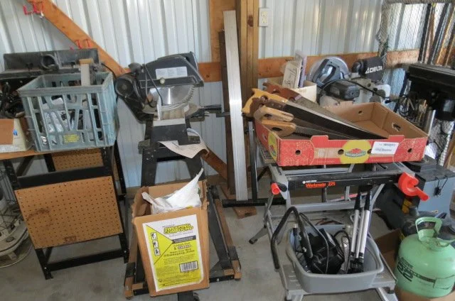 Miter saw on stand, router on table, bench drill press, Craftsman tool cabinet with top tool box, Craftsman rolling tool box, rolling tool cart, rolling compressor, pancake compressor, air hoses, hose reel, Whitney-Jenson sheet metal brake, Dewalt cordless drill, bench grinder, bench vises, dewalt reciprocating saw, circular saw, pneumatic nibbler-wrenches, pneumatic sockets, Rockwell mini saw, Dremel, detail sanders, belt sander, detail carver, brad nailer, jig saw, power plane, air finish nailer, Craftsman cordless drill, drills, Workmate, stock roller, miter box, corner clamps, bar clamps, hand saws, Robogrip wrench set, lot wrenches, crescent wrenches, pipe wrenches, squares, levels, socket set, pry bars, bit sets, hammers, sledges, mallets, putty knives, tin snips, vise grips, bolt cutter, rulers, nippers, channel locks, drill bits, hack saws, chisels, staplers, screw drivers, saw blades, lot all types hardware-nuts-bolts-screws, extension cords, work lights, Kobalt bench stool, work tables, small torch set, plumbing, electrical, .22 nail driver, rope, gauges-meters, shop vacs, dust collector, Black & Decker radial arm saw,