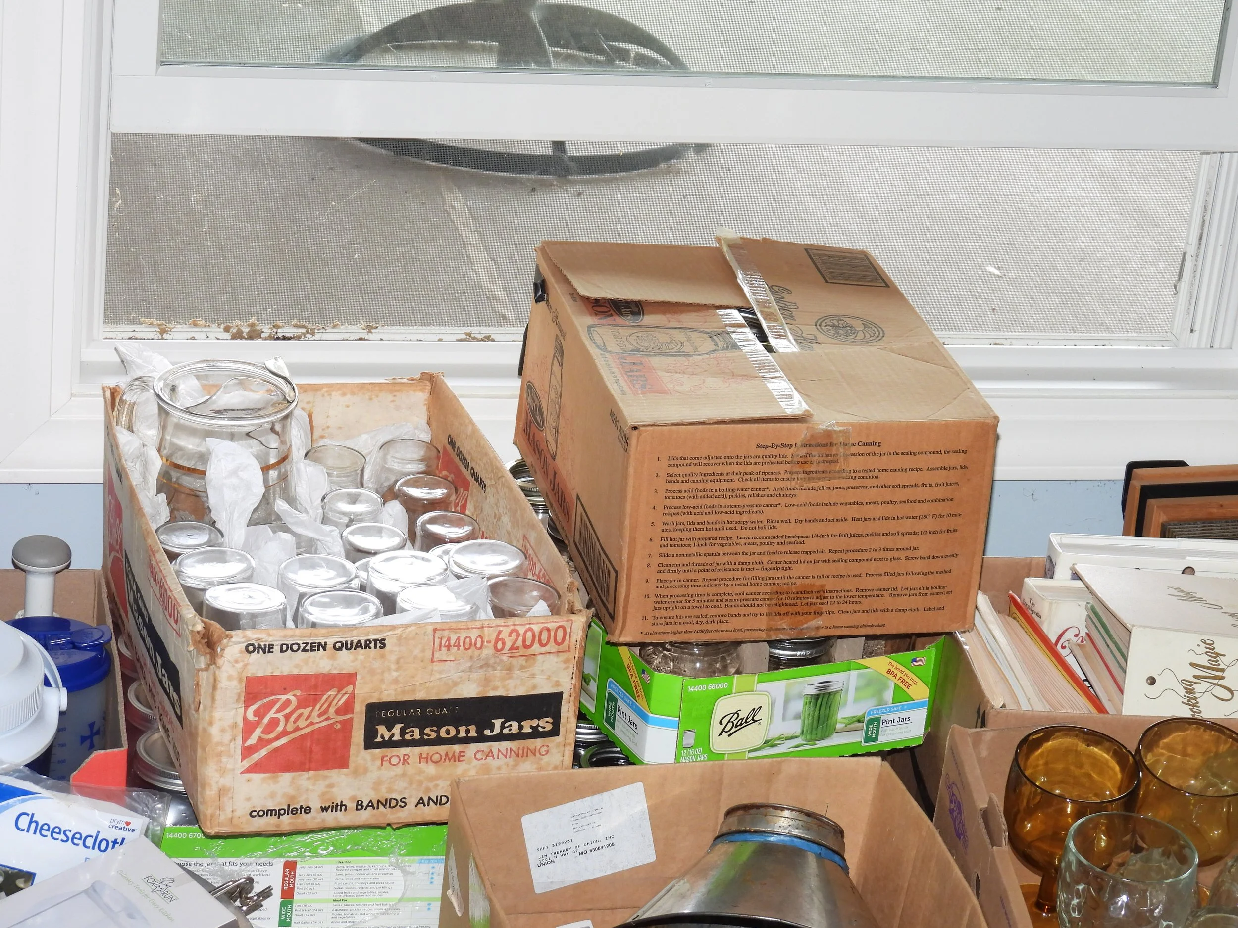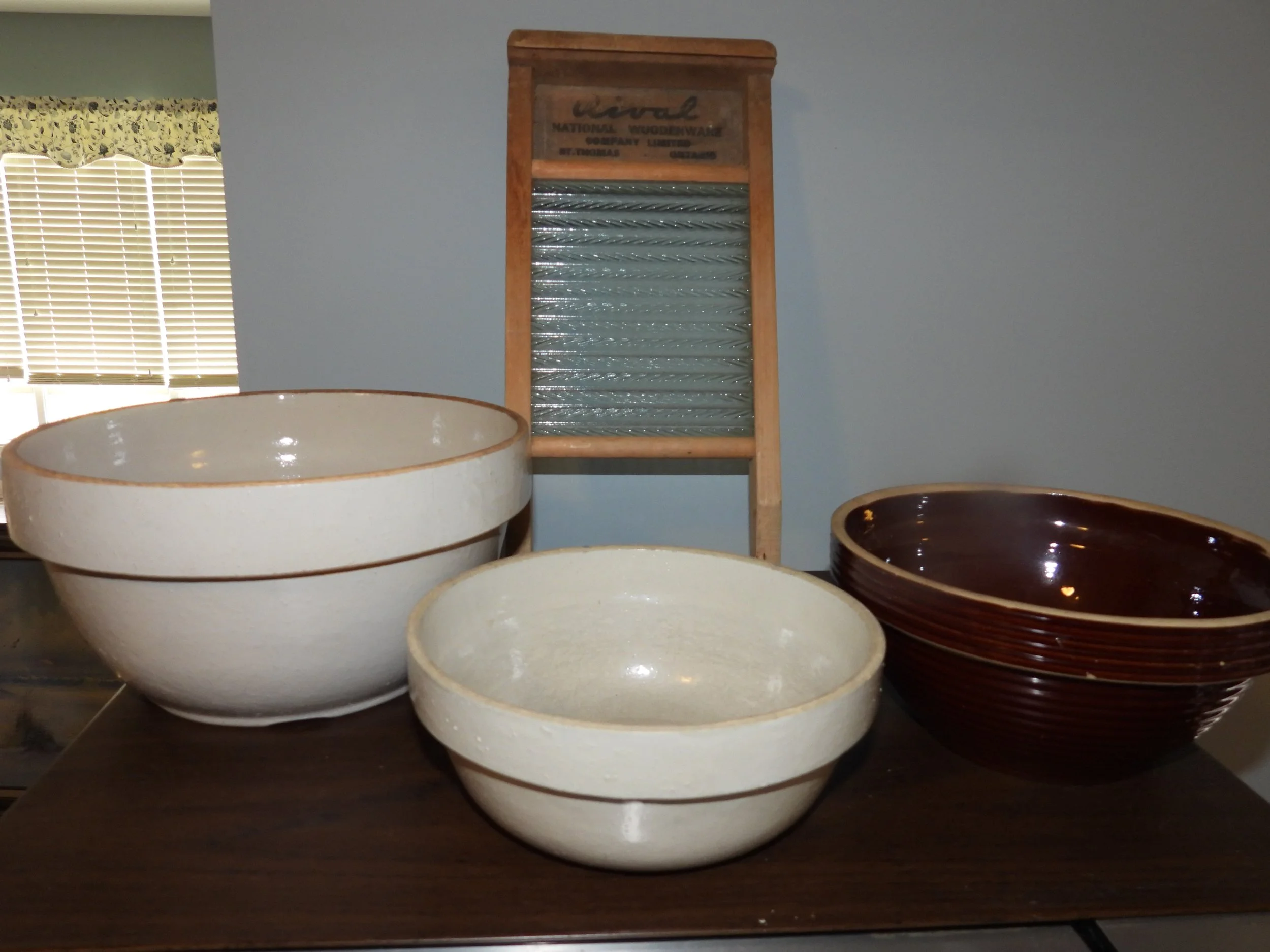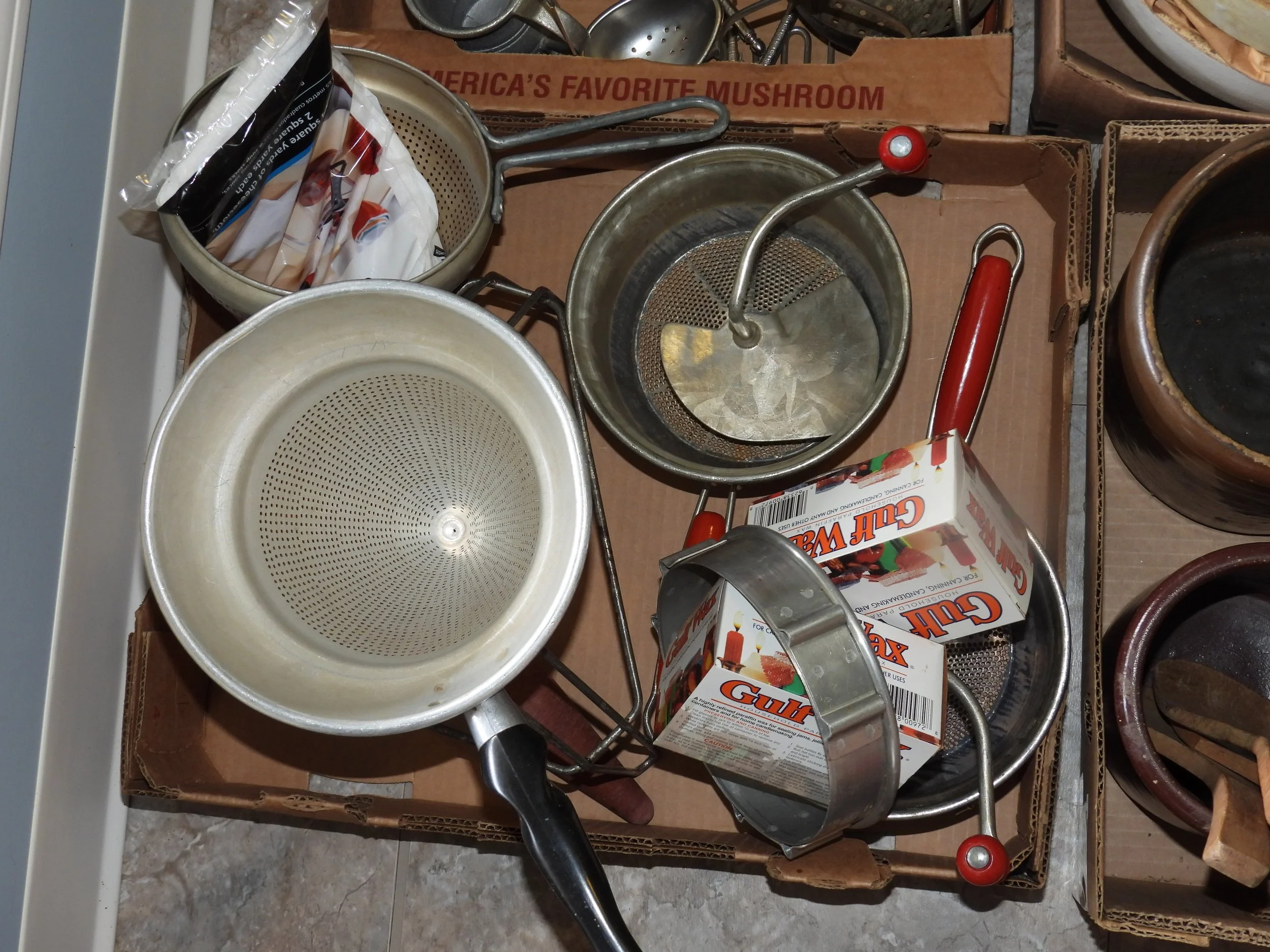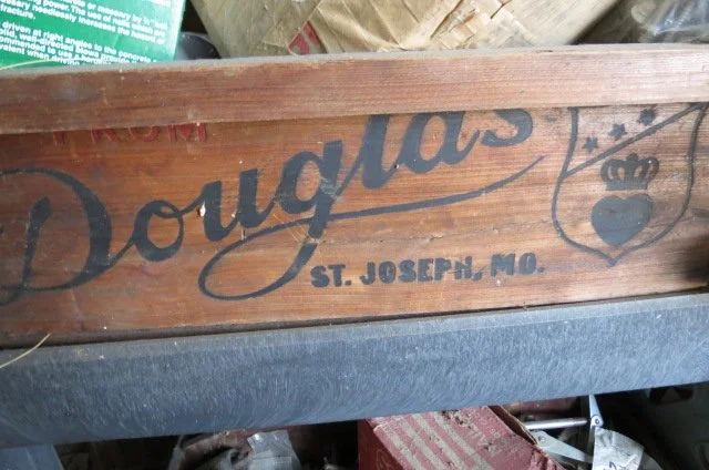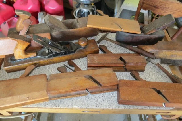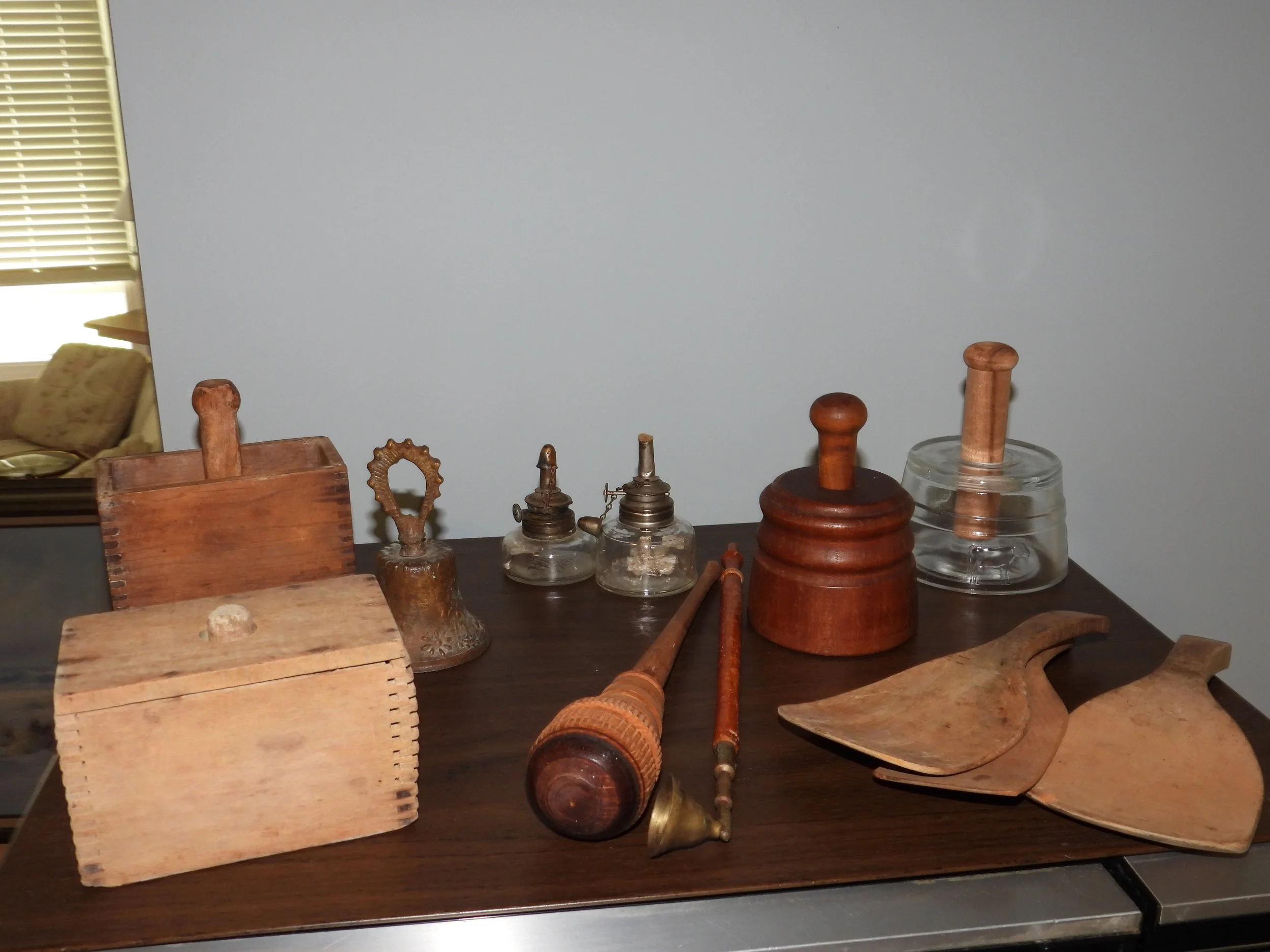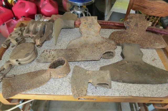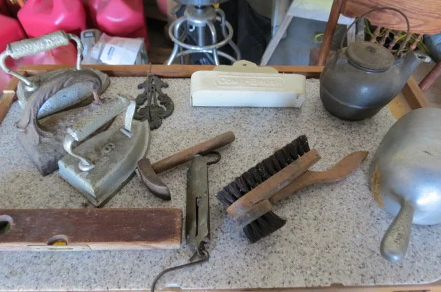Cast iron dutch oven, #10 Wagner skillet, iron bell, cherry pitter, old pulleys-some wooden, wooden advertising crates-Pevely-National Screw-Douglas, broad axe heads, ice tongs, meat saw, glass insulators, comb-brush holder, wooden tool carriers, old wooden wood planes-spoke shave-bullnose-Miller Fall-Stanley, old tools, walking plow, spectacles, German Bunsen burners, oil lamps, crock mixing bowls, galvanized sprinkling cans-buckets-tubs, copper boiler, coal bucket, enamel buckets-pans, enamel top kitchen table-pull out leafs, glass water bottle w/crate, butter molds, match safe, coffee grinder, small crocks, kraut kutter, tie quilts, afghans, glass wash board, carnival glass dish, cleaver-butcher knives,