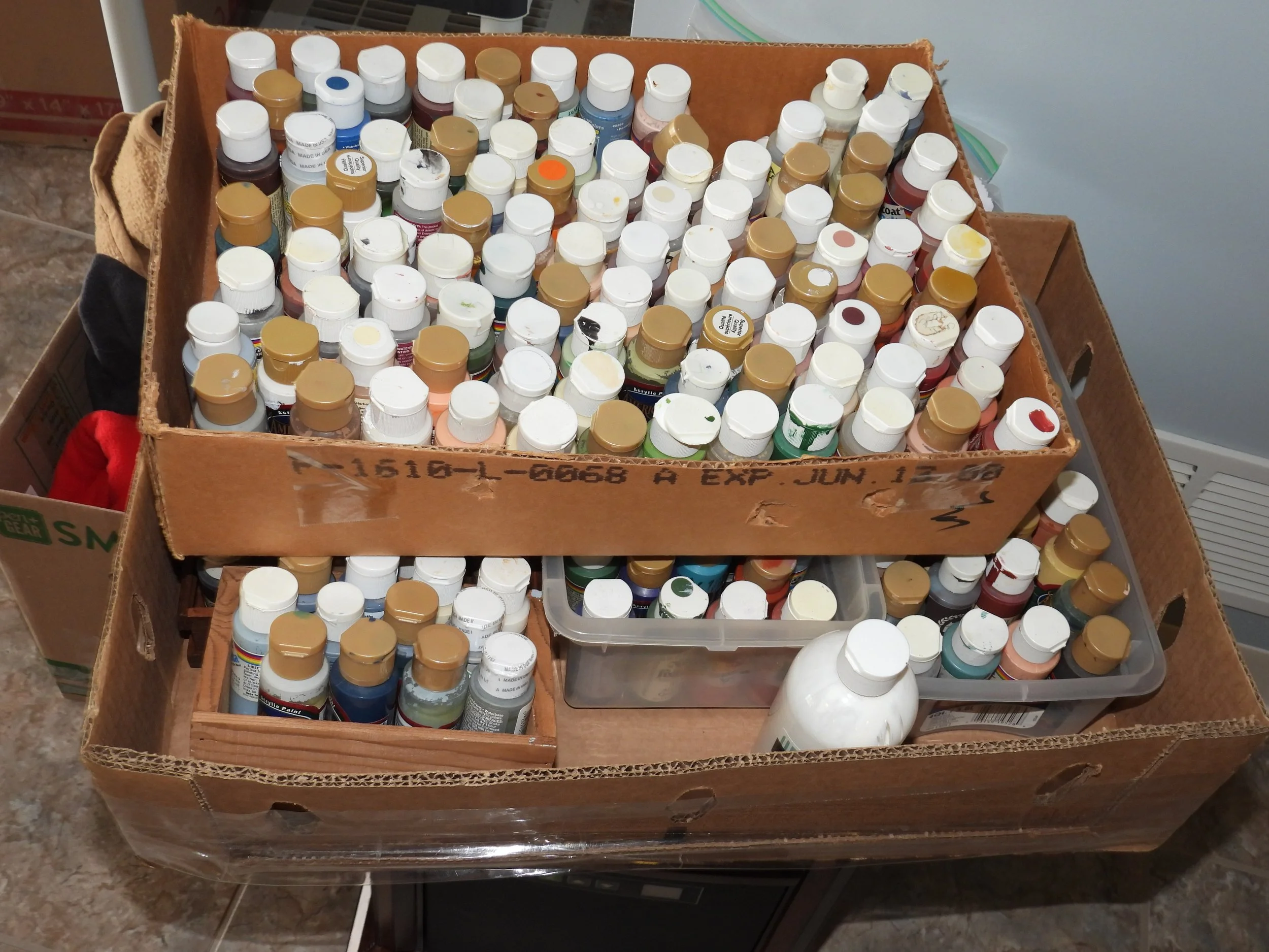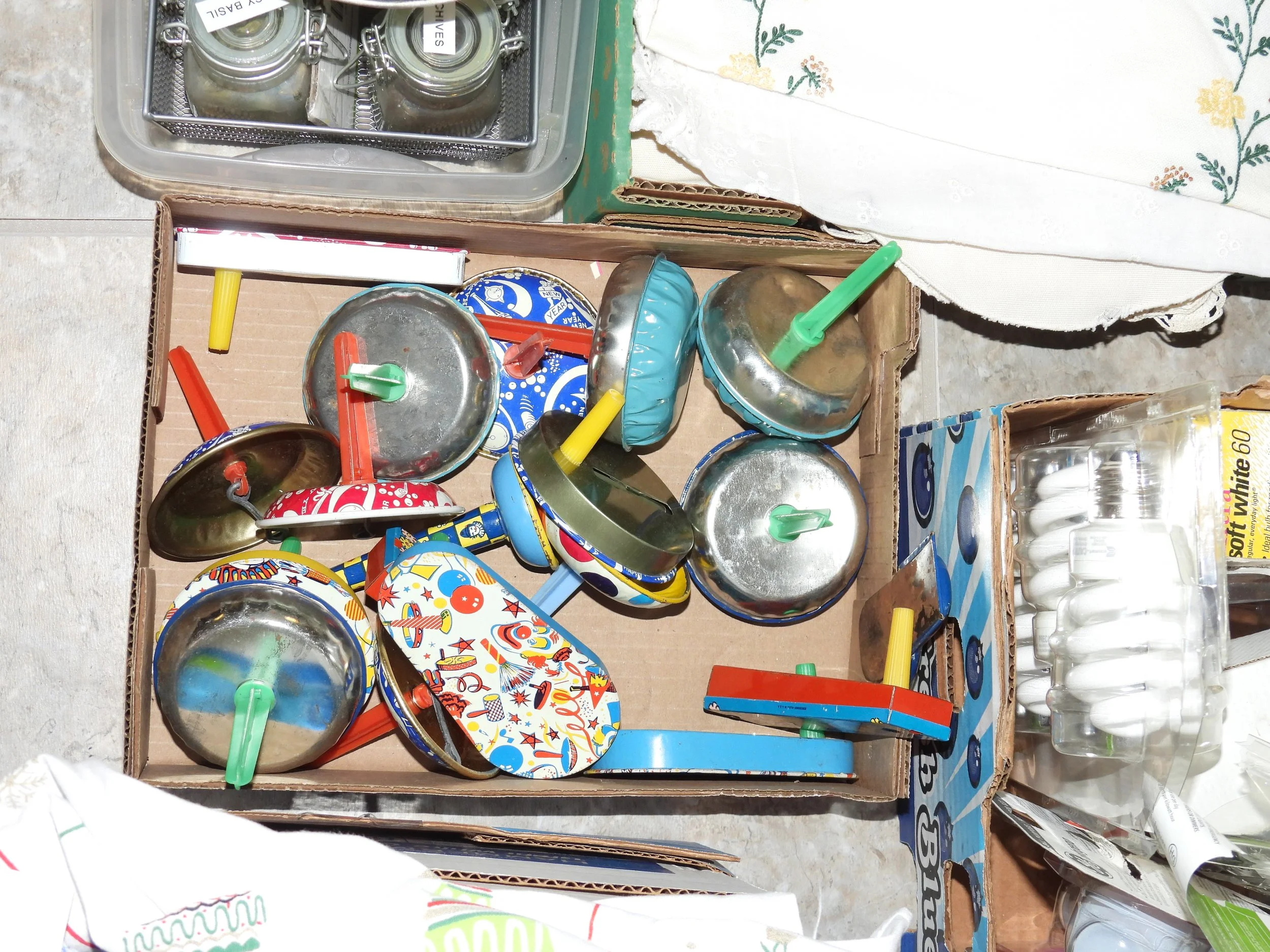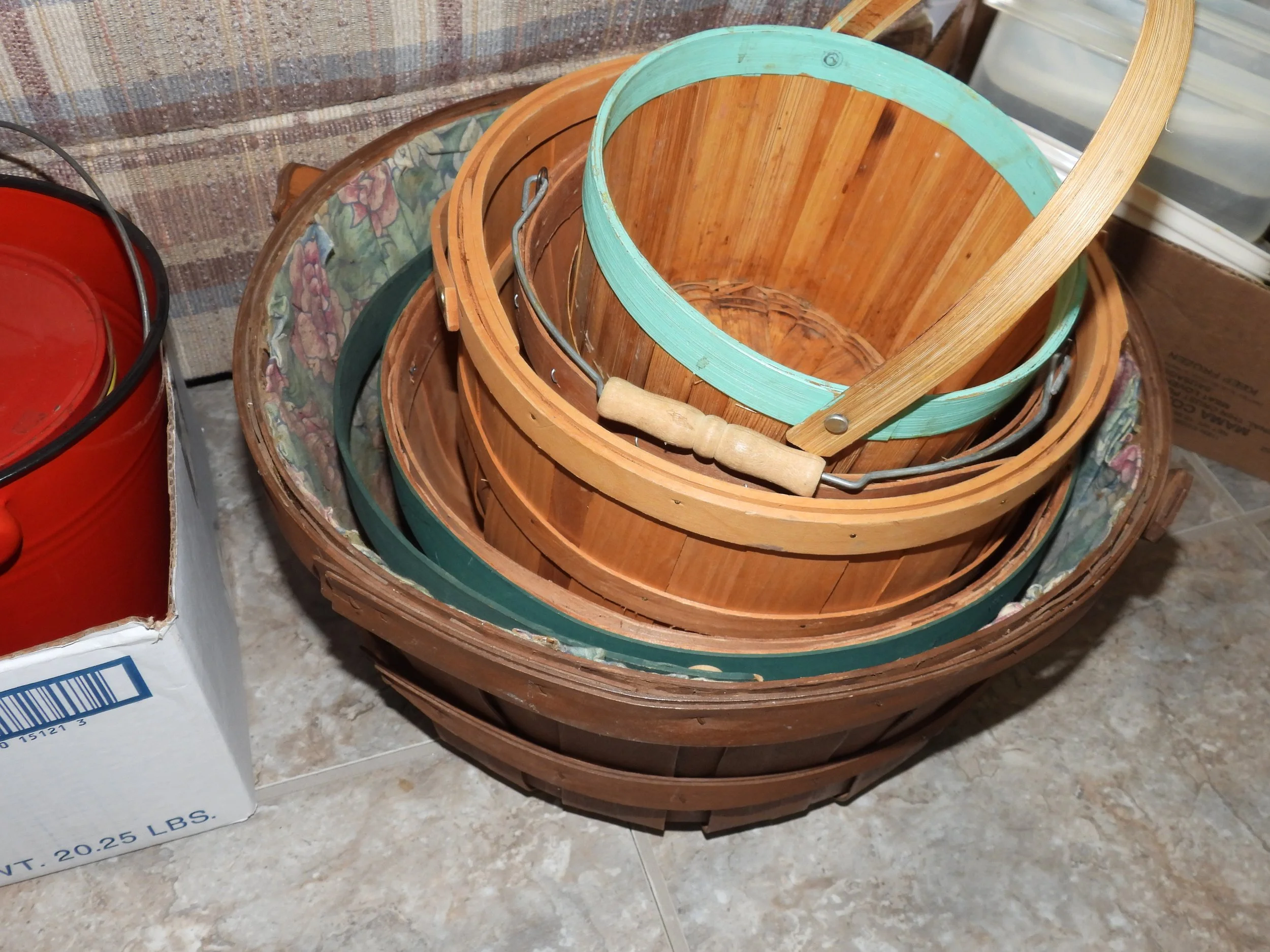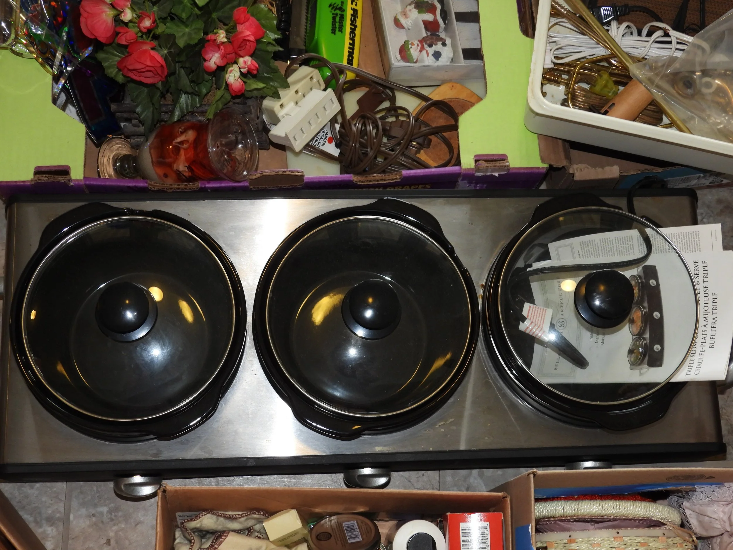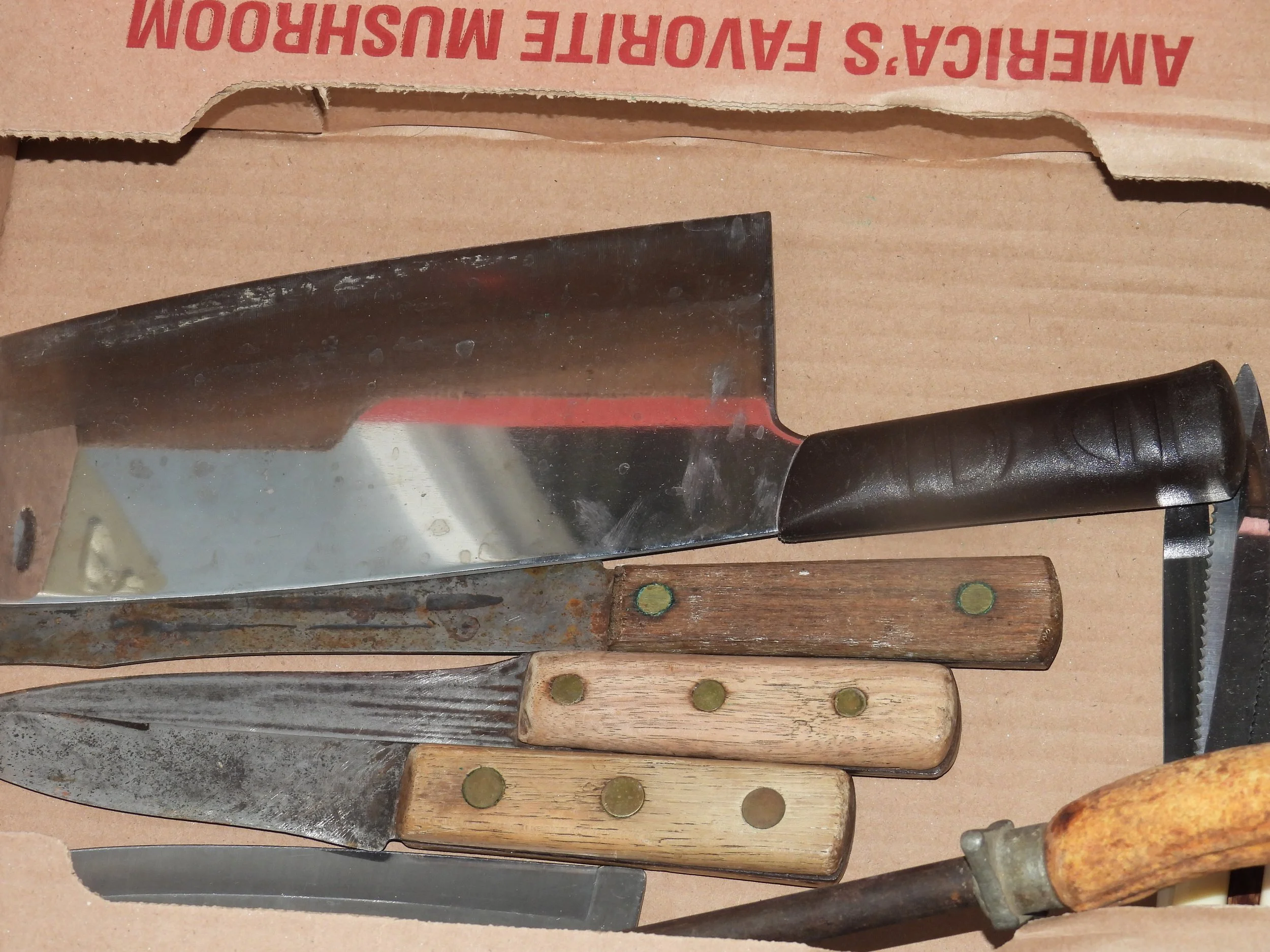 Cast iron dutch oven, #10 Wagner skillet, iron bell, cherry pitter, old pulleys-some wooden, wooden advertising crates-Pevely-National Screw-Douglas, broad axe heads, ice tongs, meat saw, glass insulators, comb-brush holder, wooden tool carriers, old wooden wood planes-spoke shave-bullnose-Miller Fall-Stanley, old tools, walking plow, spectacles, German Bunsen burners, oil lamps, crock mixing bowls, galvanized sprinkling cans-buckets-tubs, copper boiler, coal bucket, enamel buckets-pans, enamel top kitchen table-pull out leafs, glass water bottle w/crate, butter molds, match safe, coffee grinder, small crocks, kraut kutter, tie quilts, afghans, glass wash board, carnival glass dish, cleaver-butcher knives,