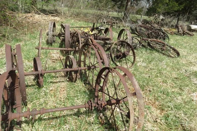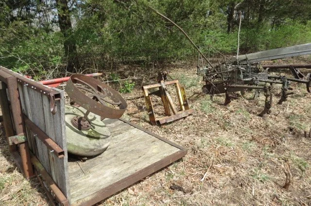 (2) plastic cattle feeders-10’-11’, calf creep feeder, round bale feeders, galvanized grain bed, hog troughs, 8’ PU bed trailer, 300 ga fuel tank on stand, slip scoop, 2 rolls field fence, 6’ T posts, baler twine,100 plus steel wheels, metal-cast iron implement seats, 12 cast iron kettles, garden plow, cream/milk cans, beer kegs, 30+ cistern top water pumps, horsedrawn farm equipment, riding cultivator, team mower, dump rake, steel wheel drill, 3 pt carryall, JD 2 row cultivator, 12’ aluminum jon boat, 3 pt tractor boom, walking plows, 2 section drag harrow, Case 2 row corn planter, 4 wooden high wagon wheels-excellent, 2 JD planter boxes, wheat cradle, WINDMILL; 30’ Aermotor Co windmill-Chicago Co 6’ wing span,