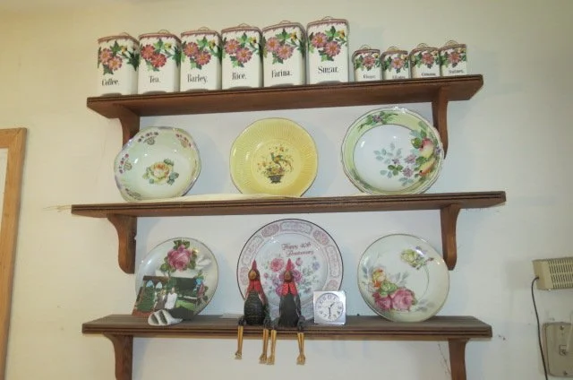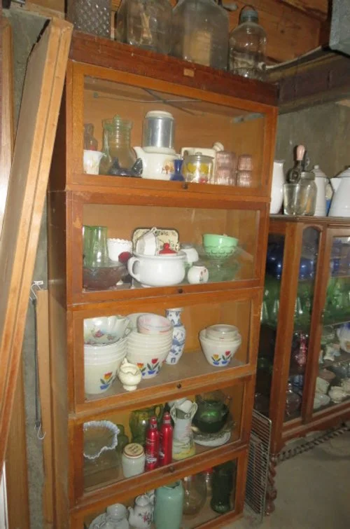 Oak wall telephone, (2) #40 Dazy churns, #20 Dazy churn, #80 Dazy churn, Griswold #6-#8 skillets, #9 Griswold Dutch oven, Griswold mini tea kettle, lot iron skillets, dutch oven, Singer treadle sewing machines, stereoscopes, spring lawn chairs, bundle forks, glass insulators, red wagon, haynes, hay spear, ox yoke, butcherblock table, wooden ice box, wooden trunk, platform scale, enamel light, corn seeder, organ stool-glass/claw feet, wooden nail kegs, ice tongs, sausage stuffer, saddle bench, Briggs wooden barrel humidor, wooden sleds, coffee grinder, egg basket, wooden crates, galvanized sprinkling can-buckets, Toms Peanuts jar, Aladin lamps, oil lamps, occ Japan pcs, marble shift knobs, Falstaff lighted clock, Busch light, Aunt Jemima pcs, QUILTS; wedding ring-star-bow tie-flower garden-others, old feed sacks, linens, pillow case sets, quilting pcs, tea towels, DISHES; 25+ pcs Fire King tulip bowls-grease jars, Superior Hall Crocus dinnerware sets-150 pc-all accessories, berry bowl sets, FK jadeite batter bowl, collection 40 tea pots-Hall-Monarch-Sadler English, painted vegetable bowls, Pyrex colored bowls, red Polk-A-Dot Fire King dishes, German hand painted spice cannister set, apple cookie jar, McCoy cookie jar, rooster cream-sugar set, ball pitcher, blue sailboat water pitcher/glass set, carnival glass vase, milk glass pcs, lot salt & pepper sets, cookie jars, glass baskets-Fenton, decorative glassware, candy dishes, bowl-pitcher set, amber dishes, hen on nest, pink/green/yellow depression dishes, lot water pitchers, carnival glass, canning jars, Old Judge jar, 50+ salt & pepper sets,