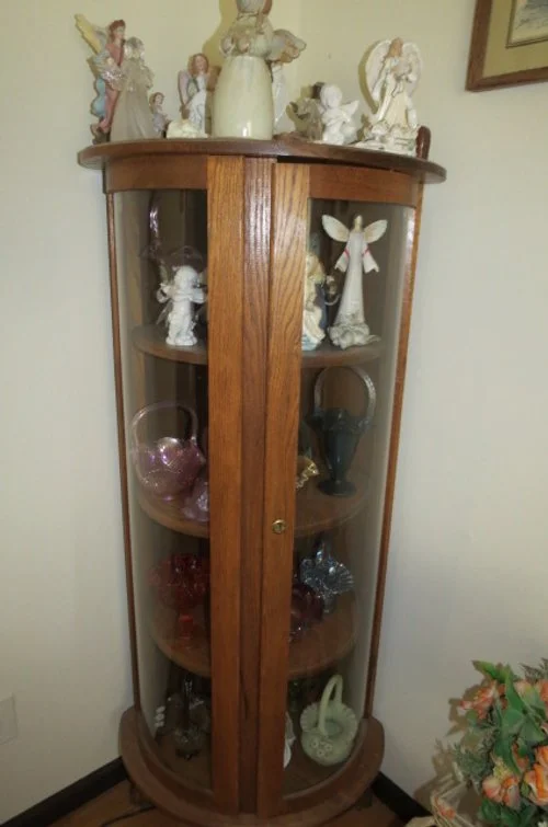 Oak pedestal dining table-chairs, oak serving buffet, oak china hutch, lawyers bookshelf, corner curved glass china cabinet, sofa-love seat, round bench, bar stools, grandfathers clock, fern stand, coffee tables, chest drawers, small drop front secretary, whicker, small tables, marble top wash stand, waterfall bedroom set, cedar chest, chairs, trunks, 6’ wooden bench, lawyers 5 shelf bookcase, display cabinets, porcelain top cabinet, lots old furniture, HOUSEHOLD; old utensils, decorative plates, pie plates, all types dishes, pressure cooker, canners, food processors, pots-pans, baking dishes, sewing basket, bedding, lot Christmas decorations, framed artwork, APPLIANCES; Maytag washer, Whirlpool dryer, chest freezer, side-by-side refrigerator, exercise bikes-treadmill, OUTDOOR; yard statuary, bird baths, concrete lawn jockey,