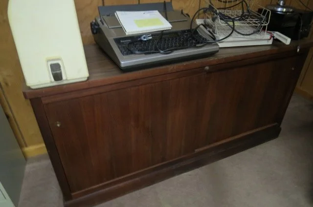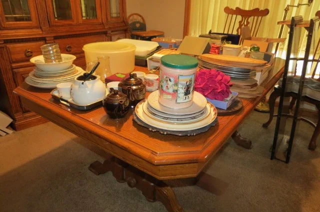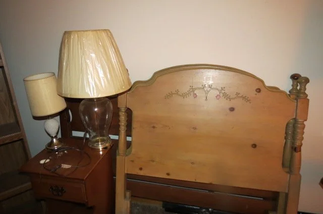 Oak dining table-leaf’s-high back chairs, oak china hutch-beveled glass-lower cabinet, oak serving buffet, dinette table-rolling cushioned chairs, pair high back side chairs, coffee tables, lot end tables, lot book shelves, full bed frame, king bed frame, chest of drawers, night stands, lamp tables, carved back floral chairs, round lamp table-drawer-brass feet, step back chest drawers on feet, single bed frame, magazine rack, TV trays, folding tables, embroidered curved arm sofa, fold up bed, swivel bar stools, cushioned bar stools, work table, exercise bike-balls, TV stand, couch-love seat-side chairs, large wooden bench, microwave cabinet, corner shelf units, knick-knack shelves, desks, printer stand, office cabinets, file cabinets, lot office supplies, pricing guns, luggage, bedding, lot Christmas decorations, vacuums, table lamps, Singer Futura II sewing machine console, portable sewing machine, games, baskets, Whirlpool glass top washer-dryer like new, microwave, VHS movies, small flatscreen TV, electric typewriter, lot artwork, coat rack, fans, heater, DISHES; stock pot, Correlle dishes, copper bottom pots, pressure cooker, strainers, cake pans, platters, seal-a-meal, mugs, stemware, utensils, crock pot, thermal cups, Fire King baking pans, FK mugs, glass cannister, batter bowl, measuring cup, coffee pot, dinner dish sets, dehydrator, counter rotisserie, silver serving platters, silver cups, toaster, candle holders, OUTDOOR; Daisy pellet revolver .177, Crossman Mark II Target pellet pistol, tent, camping table, gas camp grill, camp chairs, utensils, trolling motors, turkey fryer, outdoor furniture, hanging swing, motorcycle helmets, National Rifle Assoc videos-coin sets, Firearms Classics Library-NIB
