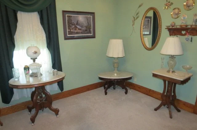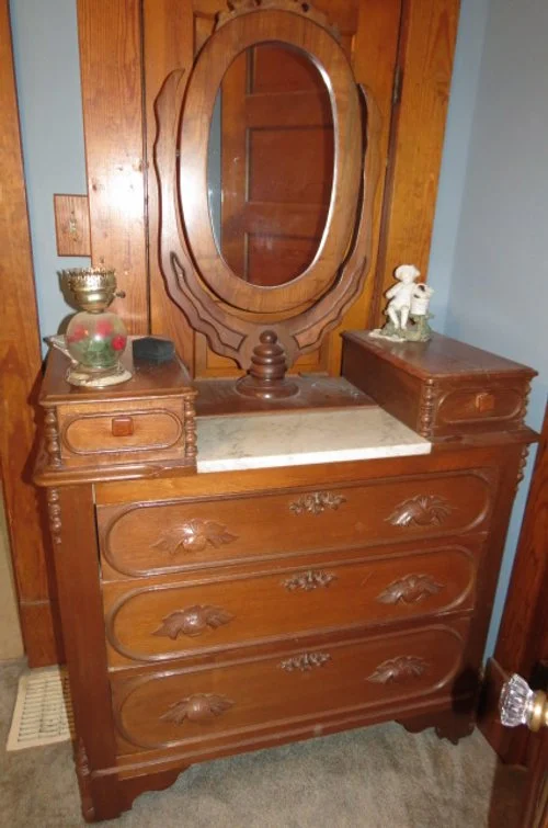 WALNUT-MARBLE; walnut-marble oval lamp tables, table with castors, oval coffee table, ornate walnut dresser-marble top-oval mirror-wooden pulls, marble top wash stand-marble shelves, Eastlake style dresser-marble top, walnut sideboard-red marble top, walnut end table w/drawer, walnut lamp table w/castors, walnut linen cabinet, oak china cabinet w/curved glass-castors, fern table-brass feet, 2 corner display cabinets w/bottom storage, Eastlake style wall mirror, oval wall mirror, pine sideboard, dining table-carved chairs/lattice seats, Tell City dining chairs, dining table, kitchen table-chairs, sofa, ottomans, oak dresser-swinging mirror, side chairs, old rockers, lot misc. dining chairs, small chest drawers, bedroom sets, blonde bedroom set, desk, small secretary, desk chairs, oak chest drawers, oak wash stand, 5 level shelf, oak bent seat rocker, pine drop leaf table, porcelain top table, whicker rocker-chairs, slat porch chairs, folding tables-chairs, rolling kitchen cart, kerosene lanterns,