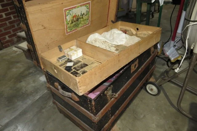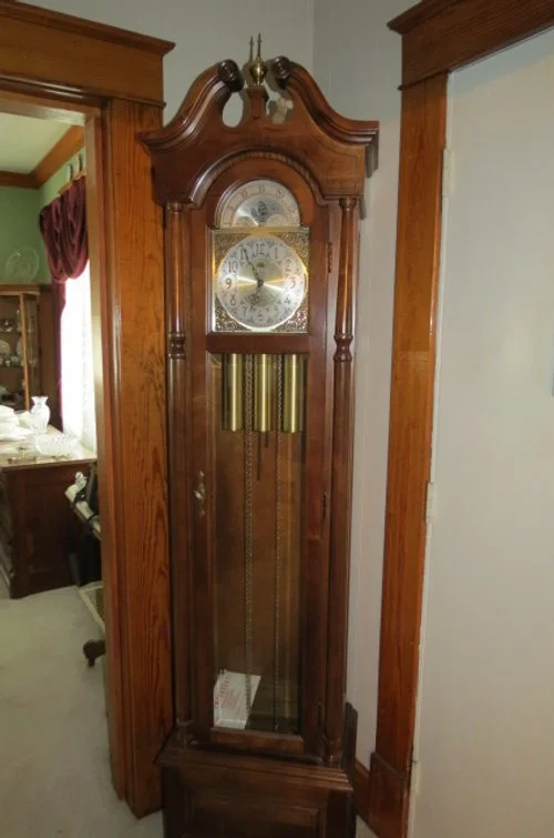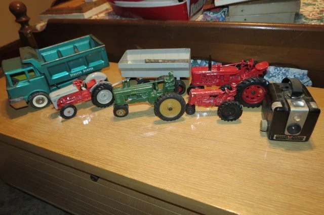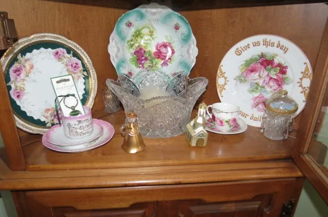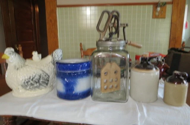 Ruckels #6 crock, #6 Western crock, #3 Western, crock bowls, angel food cake crock pan, Roseville planter, McCoy jardinière, Grand Opera Victrola, Artophone record player, cow bell, apple peelers, lot enamel pans-pitcher-bucket-pots, 4 qt Dazy churn, blue canning jars, Old Judge jar, cream can, fruit press, Remington wooden ammo box, platform scale, kerosene lanterns, Hanson 20 LB hanging scale, fish scale, lead pot, 2 man saw, brush scythe, iron kettle, cast iron skillets, New Home sewing machine base, wooden advertising box, Pepsi-Coke wooden crates, vintage Schwinn bicycle, galvanized bucket-sprinkling can, red wagon, Lionel train, N gauge train, Ertl tractors, Structo dump truck, lot other toy trucks, Japanese wind up toy, HUMMELS; over 30 Hummel figurines-Hummel clock-bank-bell set, lot other figurines, GLASS; Waterford crystal, lot crystal pieces-vases-bowls, lot painted plates-bowls-vases from-Bavarian-Nippon-German, ruby red etched pieces-lot from 1904 Worlds Fair, berry bowl sets, gold trimmed dishes, crystal stemware, golden Hall mugs, pitcher-glass sets, table sets-cream/sugar-butter dishes, glass decanter-hi-ball glass set, Japanese vase, GWTW painted lamps, Worlds Fair-hand carved ivory buttons-ink pen-S&P sets, wall coffee grinder, Smiley pig pitcher, chicken cookie jar, shelf clocks, mantle clock, Grandfather clock, lot enamel pots-pans-coffee pot, green glass butter dish, wooden butter mold, Old Hickory knife set, 1892 calling card album, German fiberboard Santas, Keen Kutter-knife-scissors, Magnavox Stereo 60, albums, 45 records, Brownie camera, over dozen hand made quilts, lot buttons, ARTWORK; Jesse Barnes framed prints, Gary Lucy print, lot framed art, wash tubs on stand, trunks, 1937 chauffeurs license, straight razors,
