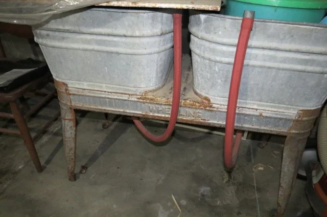 Cake stands, cake covers, cake pans, baking sheets, glass baking dishes, Westinghouse refrigerator dish, Marcrest nesting bowl set, pressure cooker, canning pots, iron skillets, bread pans, lot utensils, flatware, lot small appliances, microwave, Franciscan china dish set, glass measuring cups, electric roaster, dishes, pots, pans, coffee makers, crock pot, doilies, linens, bedding, table cloths, embroidery, lot wall shelves, sleeping bag, afghans, table lamps, luggage, metal storage cabinet, books, sewing machines, Christmas trees, lot Christmas decorations, APPLIANCES; refrigerator. Washer-dryer, OUTDOOR; bench, lawn chairs, concrete statuary, poultry brooder box,