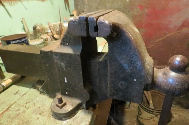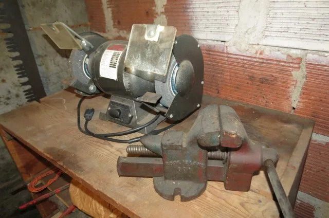Benchtop grinder, Dewalt cordless drill, small compressor, bench vises, circular saw, jig saw, drill, large wrench set, pliers, drill bits, screwdrivers, folding ruler, block planes, #7 wood plane, hand auger-bits, tin snips, nippers, hand sledge, crow bars, hand miter saw, C clamps, pipe clamp, large channel locks, small propane torch set, hand saws, hack saw, draw knife, grease gun, hand stapler, crescent wrench, screws, hardware, MOWERS/YARD TOOLS; Toro self-propelled mower, Lawn Boy push mower, 2 cycle cultivator, wheelbarrow, electric blower, pump sprayer, pitch fork, edger, push spreaders, gas cans, jumper cables, garden rakes, leaf rakes, shovels, hoes, snow shovels, hedge trimmer, loppers, wooden extension ladders, step ladders, adjustable ladder, mole traps, log chain, water hose, limb trimmer, platform scale,