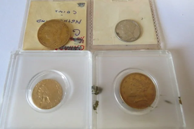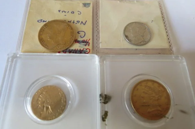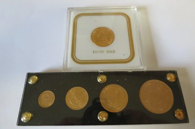 COINS/JEWELRY (coins will sell after car) GOLD COINS ; Krugerrand 4 coin type set-1 oz-1/2-1/4-1/10 oz in holder, 1898 $10 gold coin, 1897 $5 gold coin, 1912 $2 ½ dollar Indian, 1828B and 1832 10 Gulden Netherland coins, TICKET; Ticket to view execution of Wm Rudolph in 1905 for Union Bank robbery,Noon)