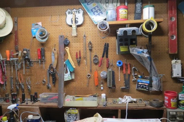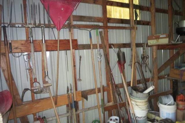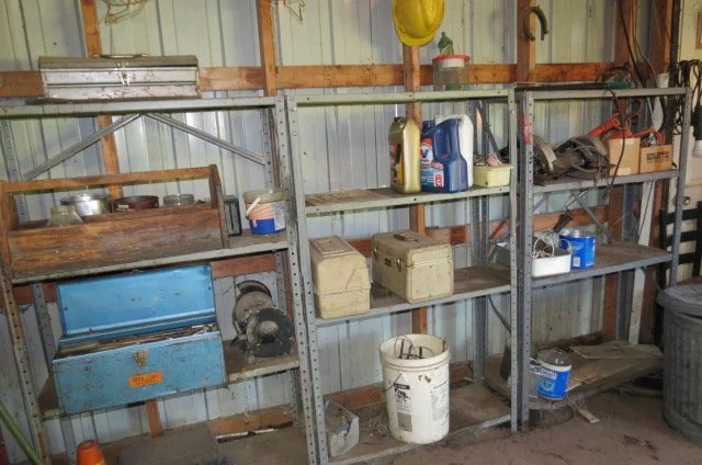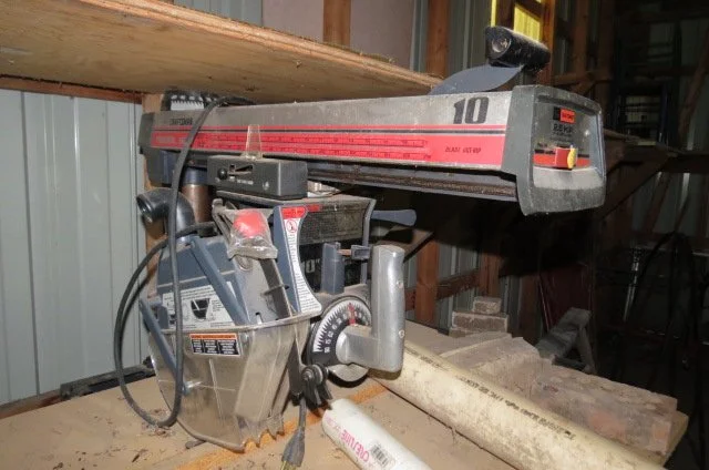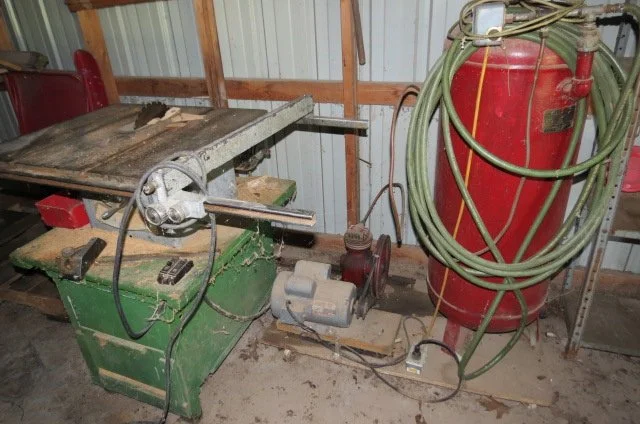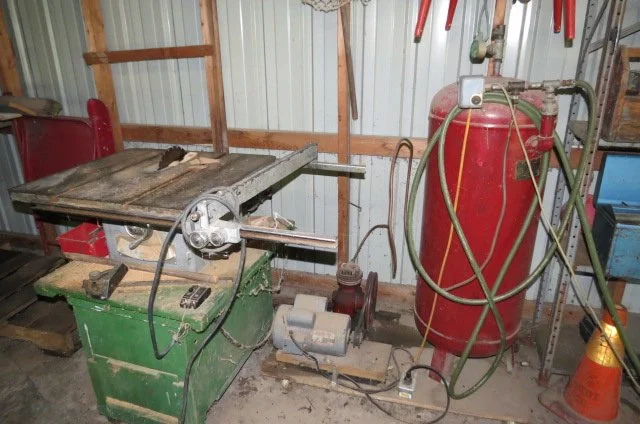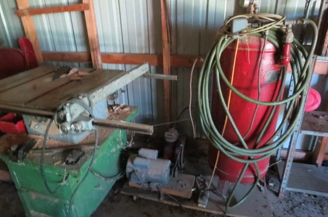 Sears bench vise, Craftsman radial arm saw, Delta miter saw, small Delta table saw, Dewalt drill, jig saw, air compressor, bench grinder, saw, router, levels, extension cords, sockets-ratchets, clamps, grease gun, tool boxes, drill index, framing square, hand saws, hand miter saw, screwdrivers, hammers, rivet tool, wood plane, pliers, flat bar, caulk guns, parts bins, draw knife, parts cabinet, hardware, cotter pins, belt sander, bench vise, metal shelves, saw horses OUTDOOR TOOLS; 12 volt ATV sprayer, 2 point boom carrier, gas mulcher, aluminum extension ladder, step ladder, electric blower, electric hedge trimmer, push broadcast spreader, lawn leaf sweeper, bundle fork, potato forks, leaf-garden rakes, axe, loppers, splitting maul, shovels, sledge, lawn roller, wheelbarrow, rope, gas cans, come-a-long, chains, cattle tubs, hand seeder, grub hoe, hoe, orange construction fence,