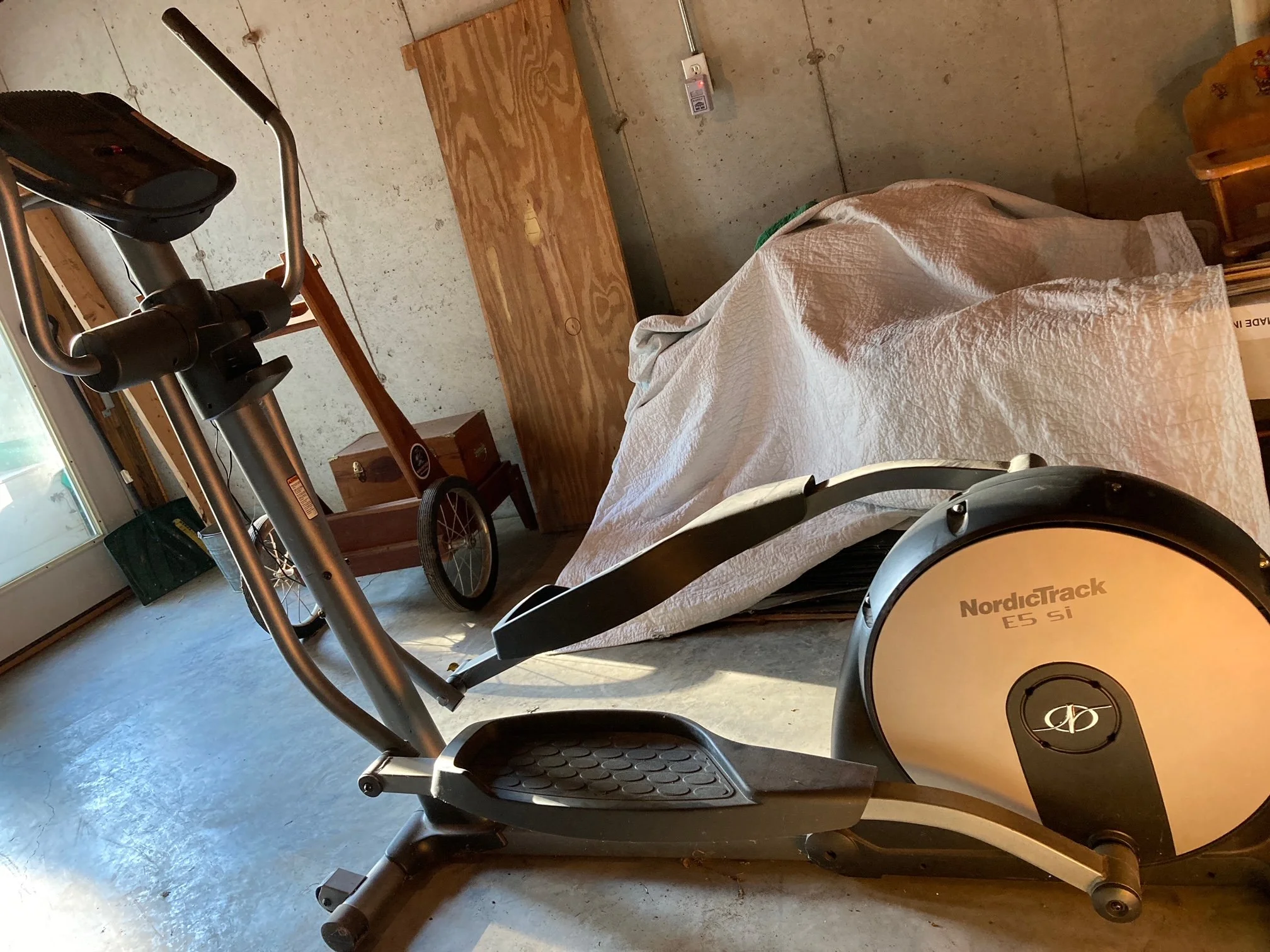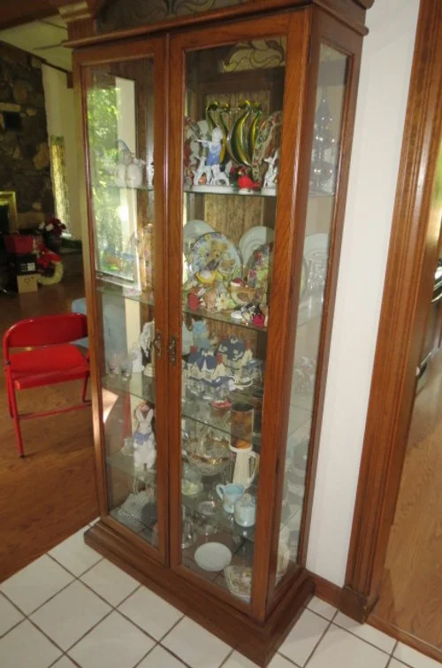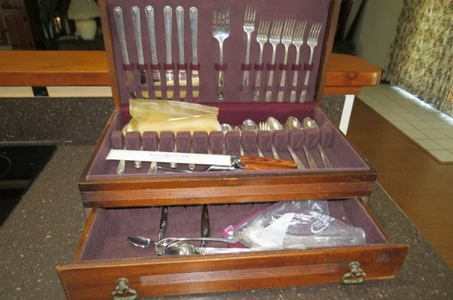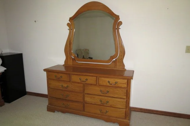 Matching dresser-chest drawers, dresser-night stand, small chest of drawers, cedar chest, pair single beds, oak desk, desk chair, file cabinets, recliner, ottoman, 3 tier shelf, heavy pedestal dining table, vinyl bucket chairs, lamp table, pole lamp, table lamps, glider-rocker, easy chair-ottoman, magazine table, side chairs, kitchen hutch, end tables, folding table, folding chairs, books, floral, wall mirror, decorative vases, figurines, candle holders, pedal exerciser, Nordic Trac elliptical, sound bar, bath scale, towels, bedding, lot framed art, vacuum, sweepers, table fan, throw pillows, luggage, KITCHEN; microwave, dishes, silver plate flatware in box, flatware, utensils, canning jars, knife block, stemware, mugs, glass measuring cups, barware, Corning ware dishes, glass baking dishes, pie pans, baking sheets, granite roasters, plastic containers, small appliances-blender, fryer-hand mixer, carving knife, pots-pans, salt & pepper, rolling pin, WASHER-DRYER