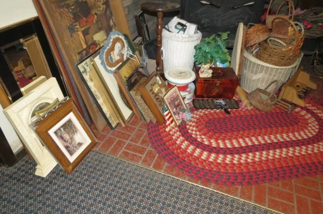 #6 Western crock, push plow, red dot Fire King bowl, glass basket, art glass pieces, kerosene lanterns, pole lamp, jar buttons, jar marbles, Old Judge jar, 2 qt blue jar, Franklin Mint collector plates, Lefton porcelain birds, Gerold porcelain pieces, lot figurines, Famous Barr fur jacket, costume jewelry, jewelry box, cast iron corn stick pan, baskets, albums, ash bucket, galvanized bucket, aluminum drinking glasses, pig bank, wooden picnic basket, vintage hair dryer chair, wooden clothes pins, iron skillets, 7UP metal cooler, kitchen scale, wooden tool carrier, old screen doors, OUTDOOR; Daisy Model 25 rifle, V front aluminum Jon boat, battery deer feeder, child’s 4 wheeler helmet, child’s horse riding helmet, iron patio set-2 chairs-table, porch glider bench, iron patio set, Weber grill, gas grill, smoker, fishing rods, tackle box, fish baskets, pet carriers, log rack, washers game, skeet thrower, golf bag-cart, lawn chairs,