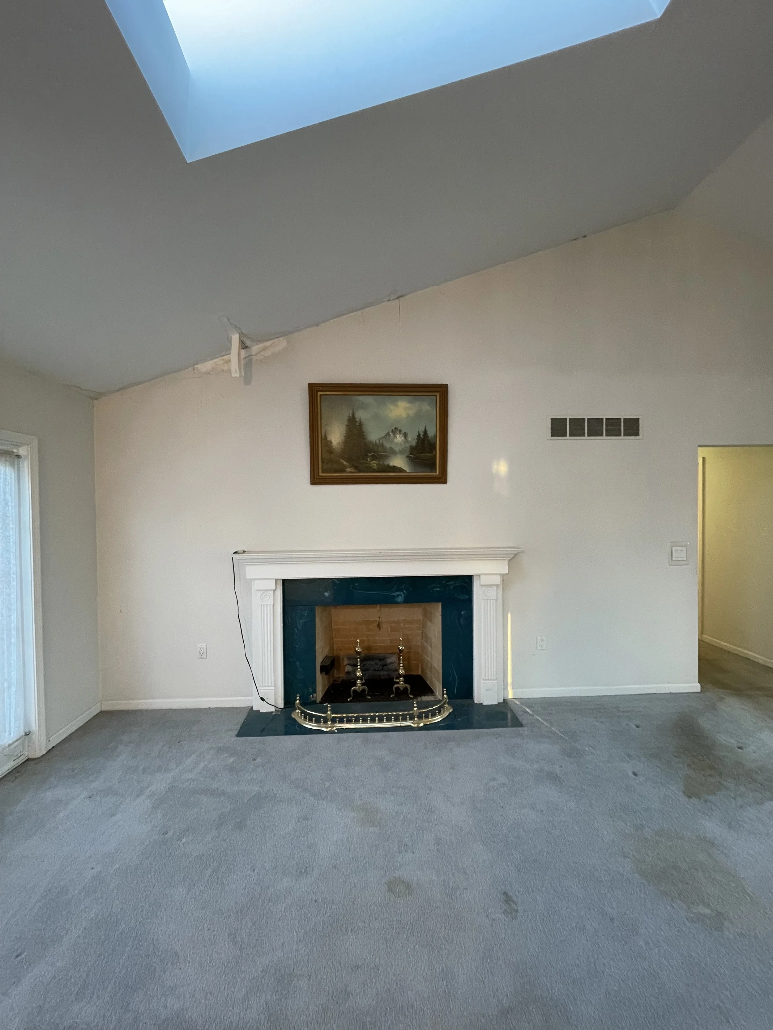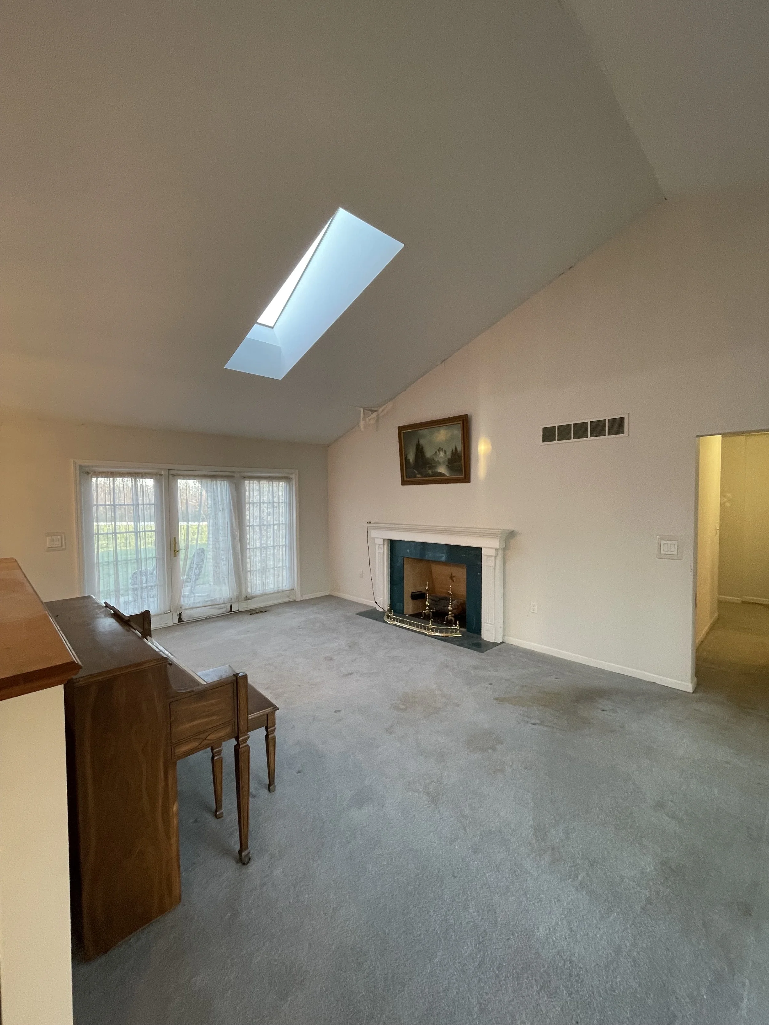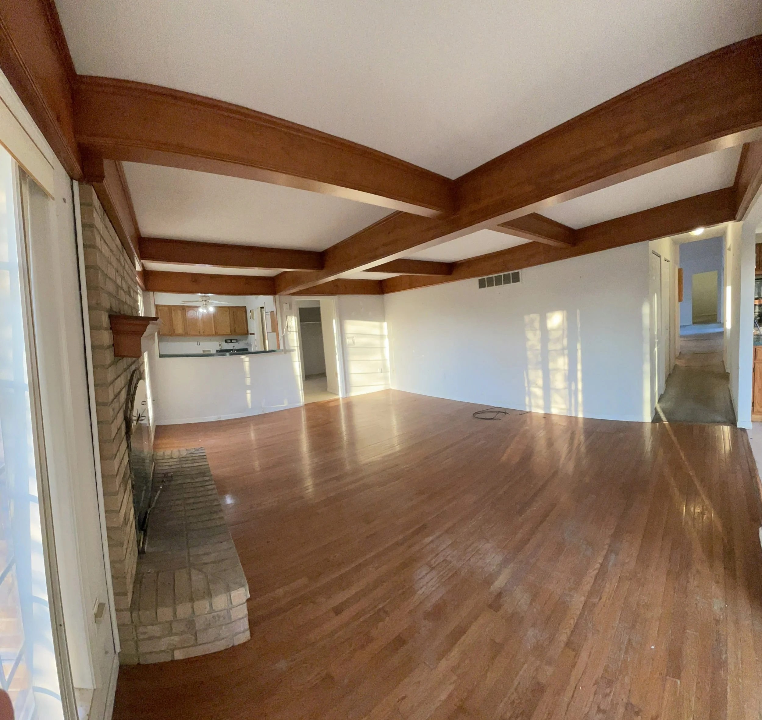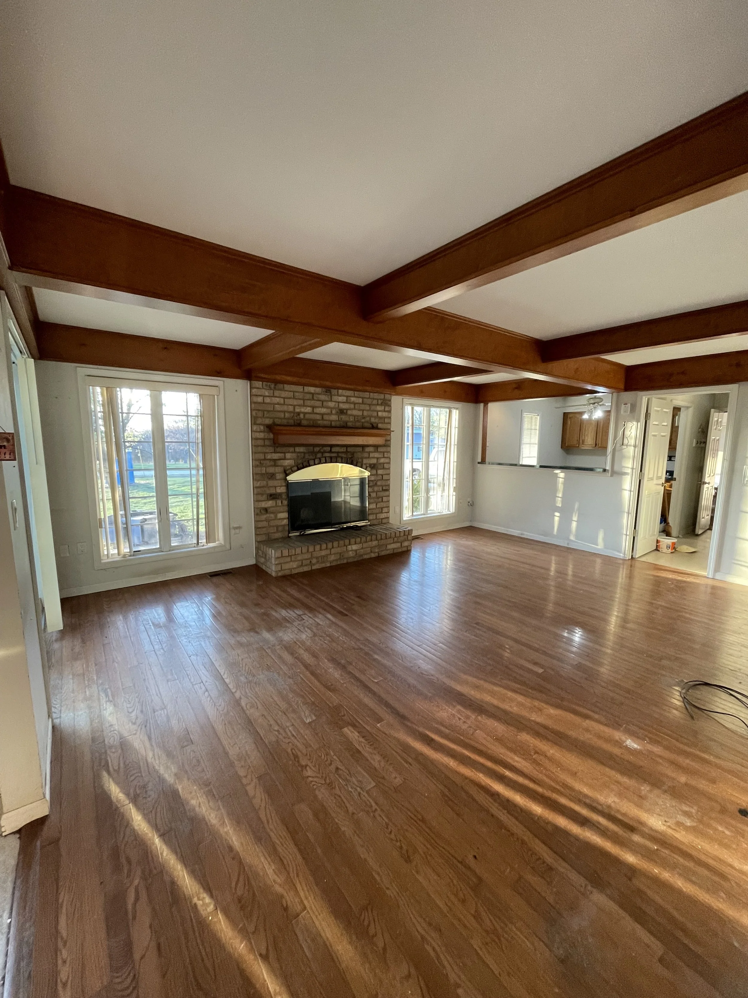 Large Den off of the kitchen with a wood fireplace, hardwood floors