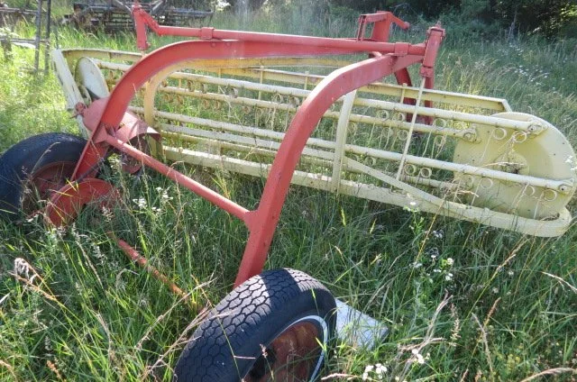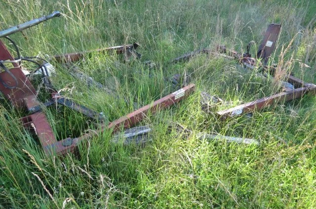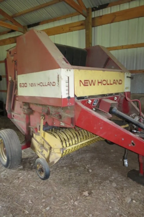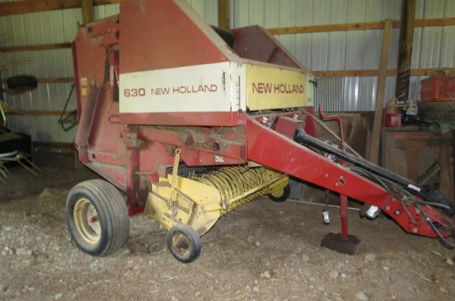New Holland 630 round baler with electric tie, M&W PT407 four basket tedder, New Holland 450 7’ sickle mower, (2) 3 point hydraulic bale unrollers, Blue River 3 pt post hole digger-9” auger, 3 pt 6’ blade-new, 6’ drag disc, 3 pt Bushhog blade, wagon running gear, 2 section drag harrow, slide in cattle rack, FARM SUPPLIES; tractor top links, lot scrap iron, skylight window-new,