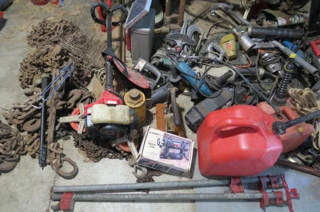 Troy Bilt 5550 watt generator, Briggs 3500W gas generator, Troy Bilt rear tine tiller, 10” radial arm saw, small wood lathe. Bench grinder, small table saw, drills, grinders, chain hoist, bar clamps, garden planter. Rakes, shovels, forks, post hole digger, axes, toolbox-full tools, logging chains, hardware-screws-nails, grease bucket, pneumatic grease gun, brush sprayer, propane torch, FLOORING; floor stripper, tile cutter, carpet dolly, grouting tools, wet tile saw, lot hand flooring tools,