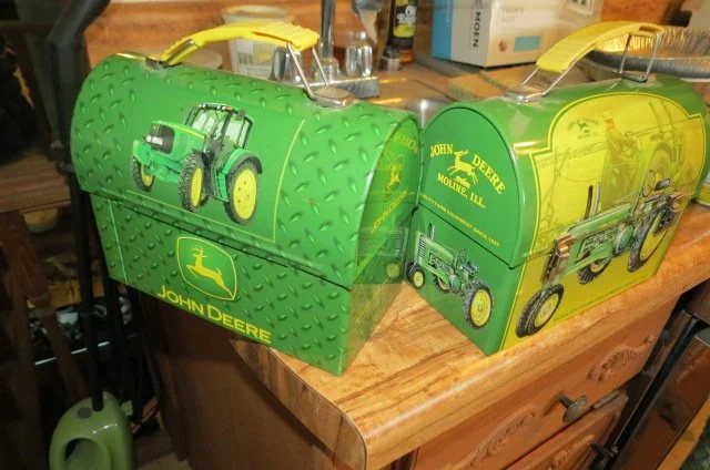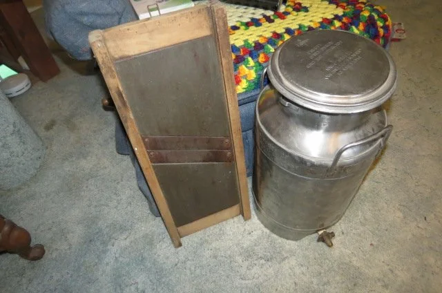 Cast iron deep dutch oven, pressure cookers, (5) SS stock pots, Hickory knives, combo deep fryer-propane, SS coffee pot, Vision ware dishes, crock pots, toaster oven, Igloo coolers and water jug, ricer, copper tea pot, metal cream can, kraut cutter, old molasses press, small wood stove, John Deere lunch boxes, kerosene lamps, brass bell, hand ice crusher, Cardinal Football glasses, many more items not listed