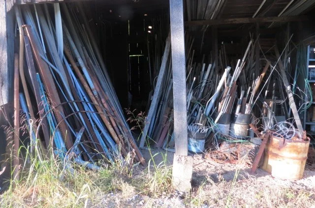 socket set, large sockets, C clamps, hand saws, 3’ pipe wrench, pipe wrenches, grease guns, fencing tool, tin shears, clevis hooks, pins, lots hardware-all types, files rasps, part bin, punches, tool box, pitch fork bundle fork, post maul, sileage fork, scoop shovels, rakes, shovels, hoes, post hole digger, pick, splitting maul, crow bars, battery charger, funnel, motor oil, grease, rope binders, log chains, extension cords, rope, long scaffold board, wooden extension ladders, bottle jack, single strand electric wire, romex, COLLECTIBLES; 5 gallon metal cans-John Deere-Shell-MFA-Sinclair, green enamel light, implement wheel, washboards, laundry boiler, gas nozzle, wooden boxes, old shed doors, old pulley, hay hook, air compressor, galvanized bucket, brush scythes, single trees, tongue,