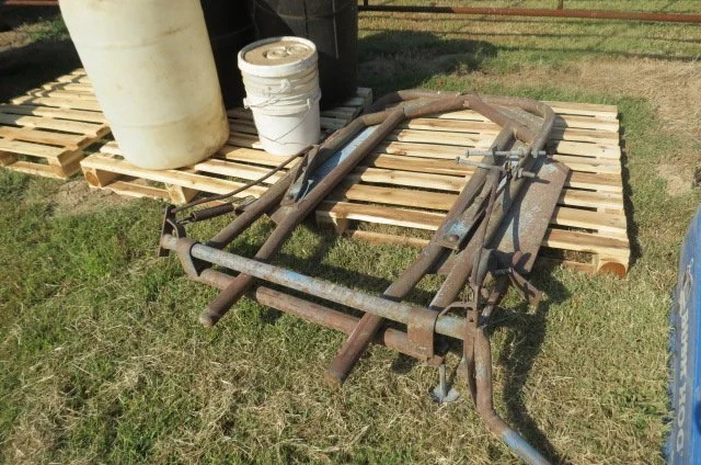 2 calf creep feeders, cattle head chute, lot farm gates. Cattle panels, used T posts, barrel w/hand pump, feed boxes, feed pans-tubs, 12’ new galvanized tin sheets, 24’x12’ dog pen-dog houses, TACK; leg wraps, chaps, blankets, girth straps, bridles, bits, lead ropes, feed bags, stirrups, bridle plaques, lot horse magazines, vet mags, leather horse collar, haynes, lots new horseshoes, lariat, barn cart, 200 sq. bales grass hay last years hay