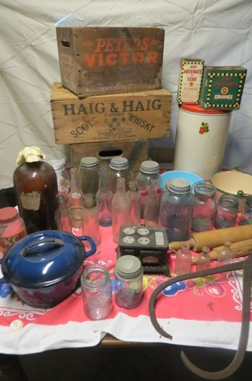 Peter Wright anvil 1-2-23, wooden tool carriers, draw knife, spoke shaves, 2 man saw blade, large saw blades, hand corn sheller, corn sheller on wooden stand, hanging produce scale, Carter Carburetor cabinets, US compass, wash tubs on stands, wash tubs, wooden stand laundry washer-ringer, ice tongs, porcelain wood stove, parlor stove, kerosene heater, coal bucket, wine press, cream cans, oil cans, WOODEN BOXES; Pepsi crate, milk crate, fruit boxes, Haig-Haig whiskey box, Peters-Victor shotshell box, camp ovens-Boss Oven, copper boiler, tricycle, wooden cart-wheelbarrow, hay fork, push cultivator, porcelain light hoods, HORSE; Remington “Mountain Man” sculpture, cow-goat bells, sleigh bells, horse statues, horse artwork, horse harness brass, horse rocker-toys, CROCKS; lot crock jugs-W. Schneider St Louis crock jug, lot small crocks, #2 crock, crock mixing bowls-pitchers, Silver Swan table fan, Emerson fan, blue canning jars-pt-qt-2 qt, Old Judge jars, soda bottles, medicine bottles, cast iron enamel dutch oven, miniature “Eagle” cook stove, enamel pots-bowls, paper hornet nests, glass insulators, McCoy and Hull planters, lot other planters, McCoy mugs, painted dishes, bell collection, Denim Days figures, lot other figurines, green depression cookie jar, kerosene lamps, Shawnee cat pitcher, carnival glass, pocket watches, Rosebud Hardware thermometer, metal butter churn, curved glass picture frame, buttons, 1913 calendar, 1904 Worlds Fair award button,