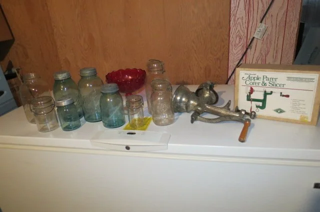 Copper apple butter kettle-stirrer, old wooden advertising boxes-Western Xpert shell box, egg baskets, old pulleys, cow-goat bells, 2 man saws, hay knives, hay spear, horse team rigging, haynes, leather collar mirror, wagon tongues, kitchen scale, enamel pan, blue swirl enamel coffee pot, oil jar, draw knives, grocery carts, Blue Grass Chains sign, washboard, tobacco cans, oak wall telephone, tongs, Robin Hood-Popeye lunch boxes, wooden sleds, wooden spoke wagon wheels, iron implement wheels, implement seats, rake teeth, milk can, hub caps, 5 ga MFA can, wash tubs on stands, metal milk crates, JC Penney bicycle, Western Flyer bike, Huffy bike, enamel ruffled light hood, steel wheel wheelbarrow, Elgin shelf clock, diecast cars, tin noise makers, Jarts game, blue canning jars-2 qt-1qt-pint, small fruit press, Singer treadle machine base only, dolls, doll crib, small child’s chairs, kids books, toys, games, cookie cutters, View Master-case, wooden blocks, kerosene lantern, Harkerware cake serving set, colored glassware, Crescant mini cast iron stove, ornate parlor stove, Hitachi mini TV, albums, pitcher-bowl set, typewriters, old cameras, Bibles,