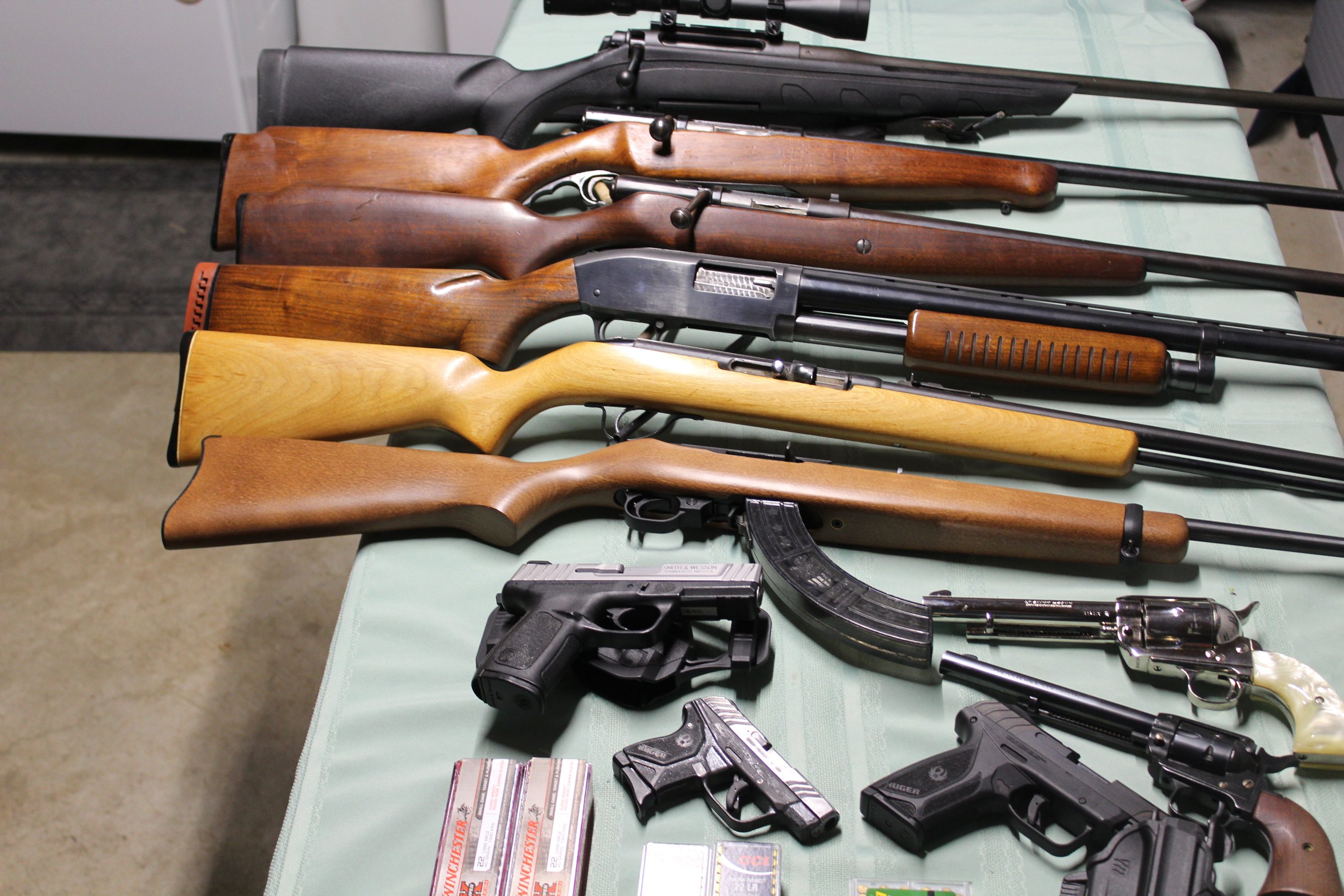 LC Smith dbl barrel 12 gauge, Stevens Model 66-B bolt action .22 rifle, Remington M 742 Woodmaster 30-06 Springfield semi-auto, Remington 770 30-06, Ruger 10-22 .22 rifle, Stevens 87J .22 rifle, JC Higgins M 20 12 gauge, Westernfield M140 16 ga, Mossberg 185 20 ga, PISTOLS; Ruger Security Nine 9MM, JP Sauer .45 Colt, Heritage Rough Rider .22, S&W SD40 .40 caliber, Ruger LCP .380, 100 rounds Colt 45, 300 rds .22 LR, OUTDOOR; (2) Case knives, German dagger, meat saw, propane turkey cooker, fishing rods-reels, ammo box,